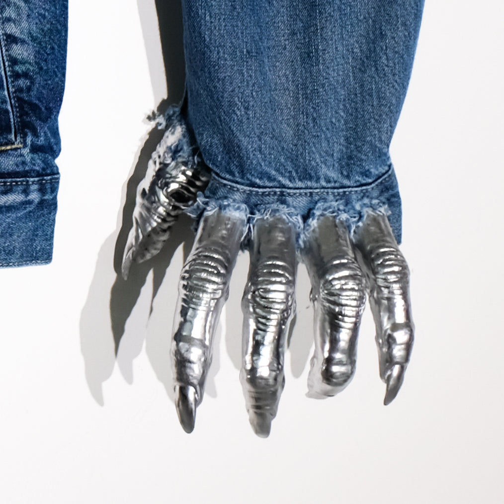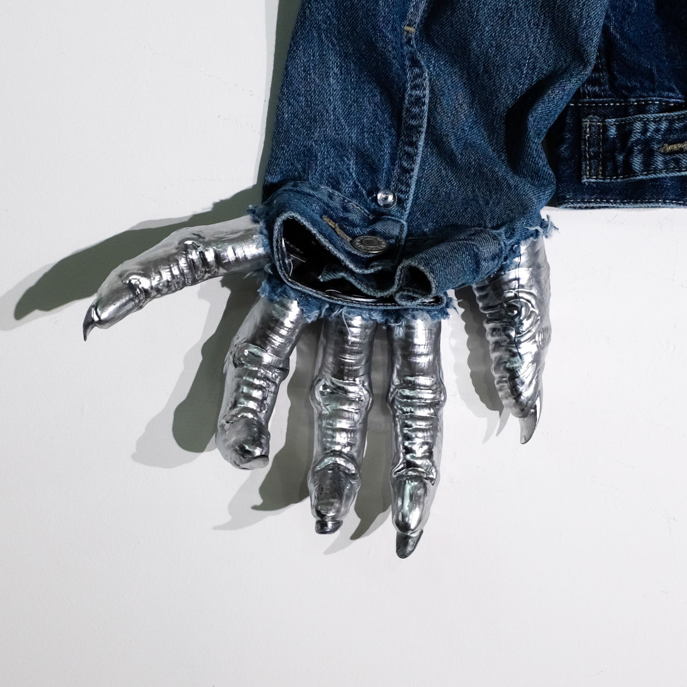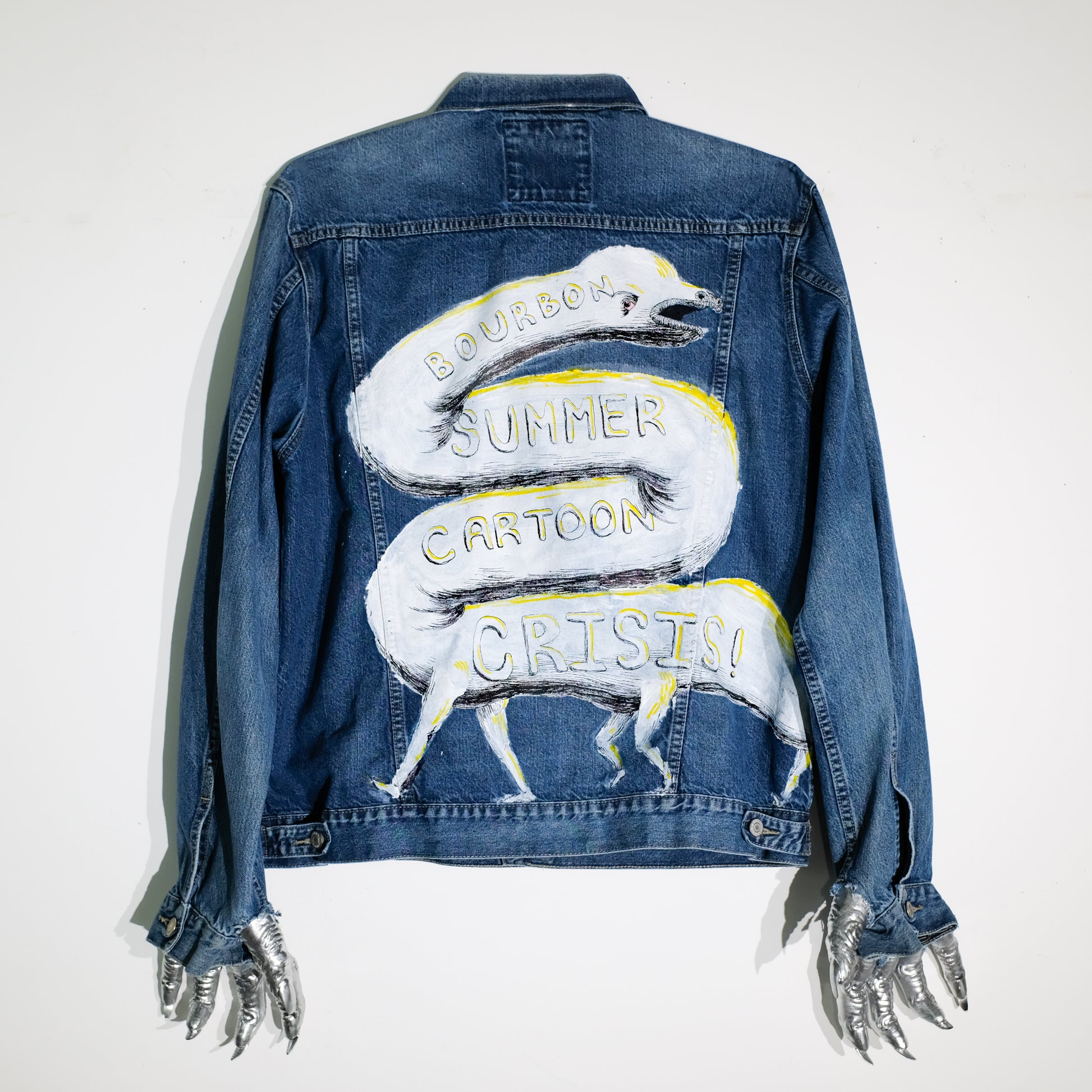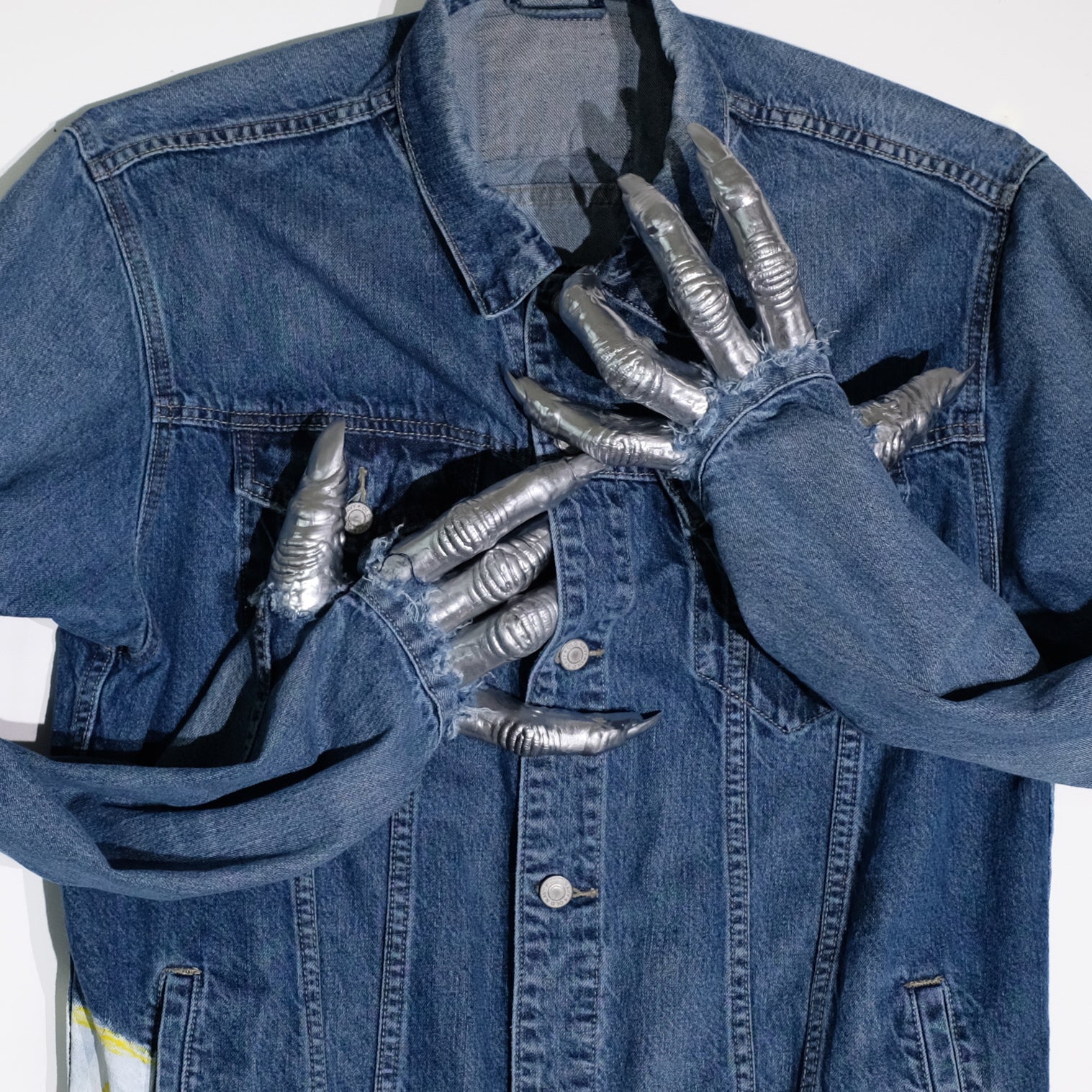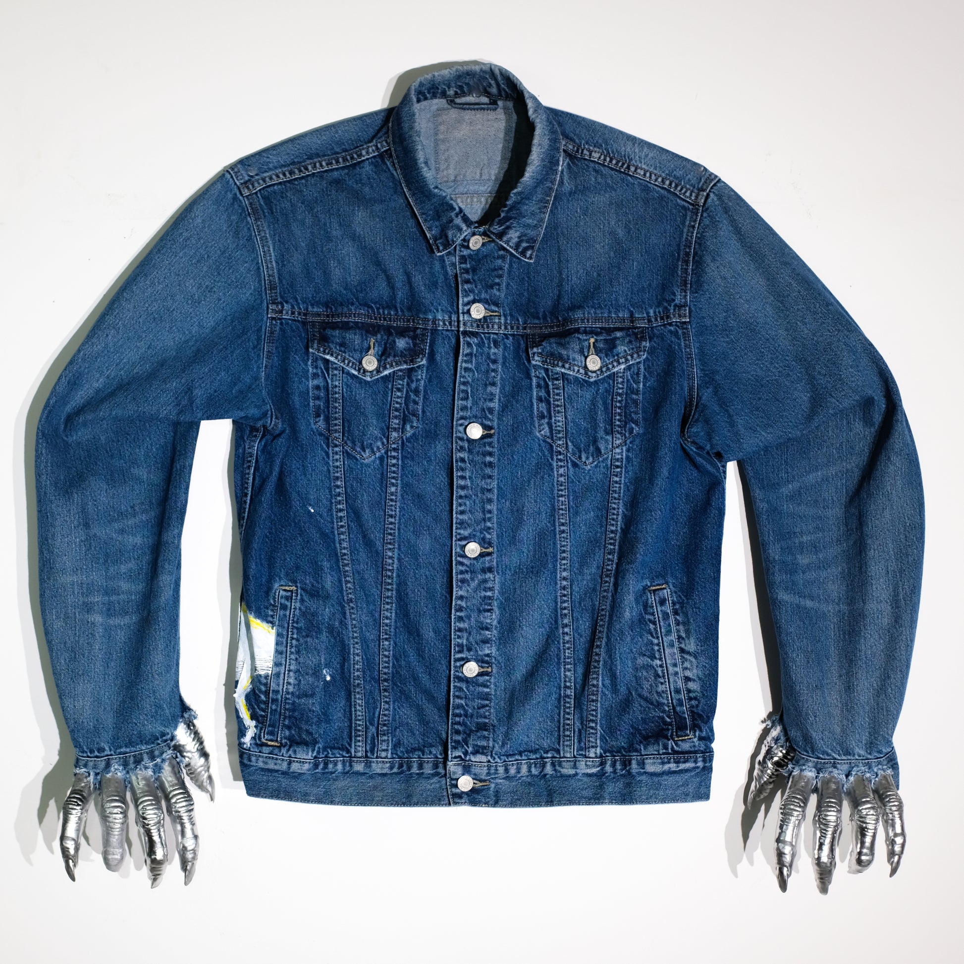Full-length denim jacket with hand-painted Eel creature with custom attached fingers/claws.