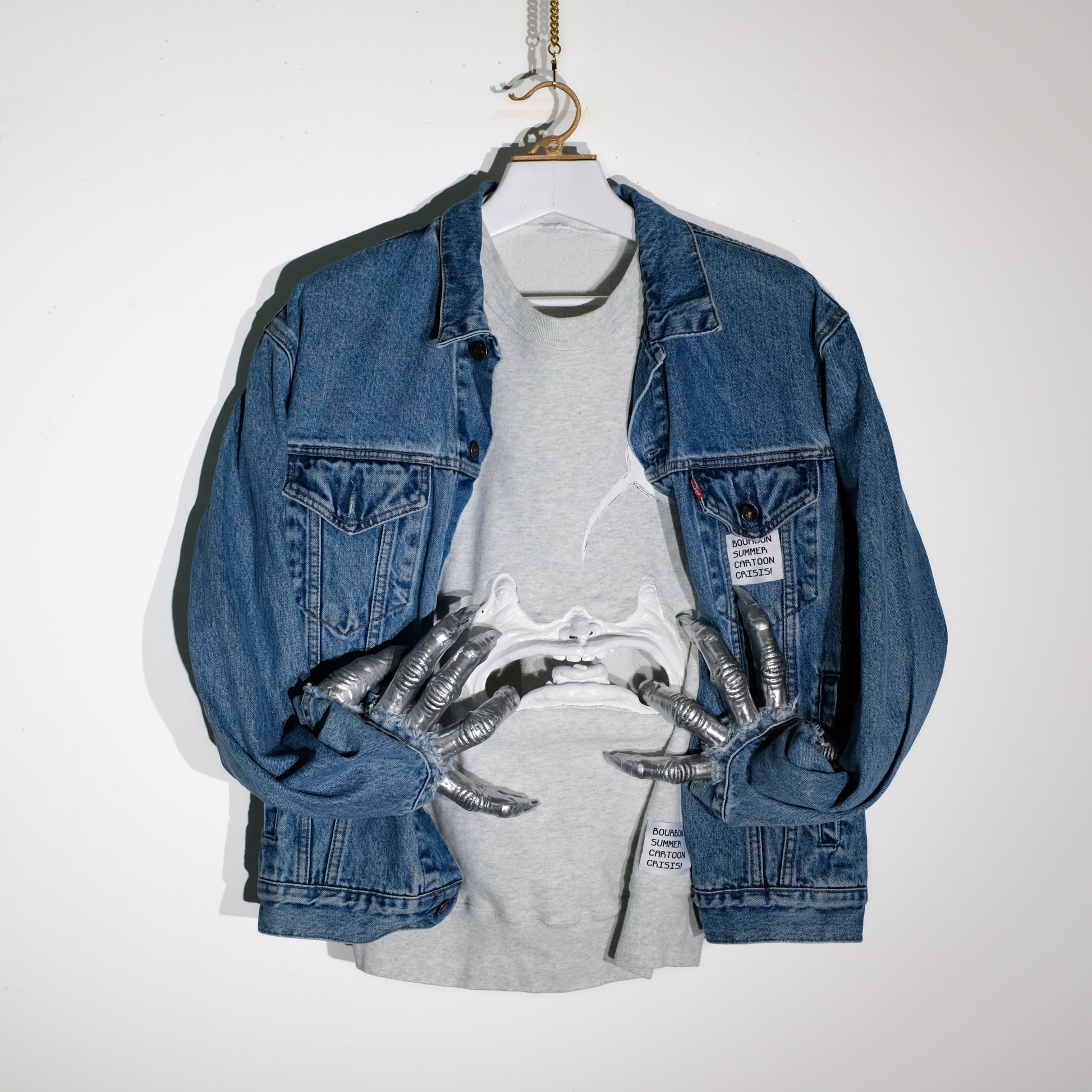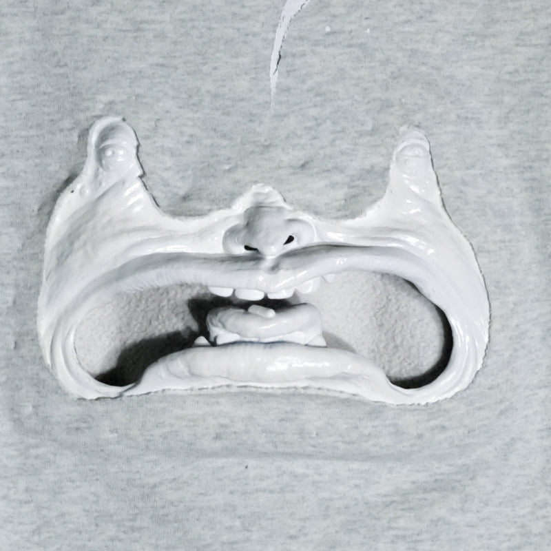 Featuring a 3D monster face on a heather gray cropped short sleeve sweatshirt