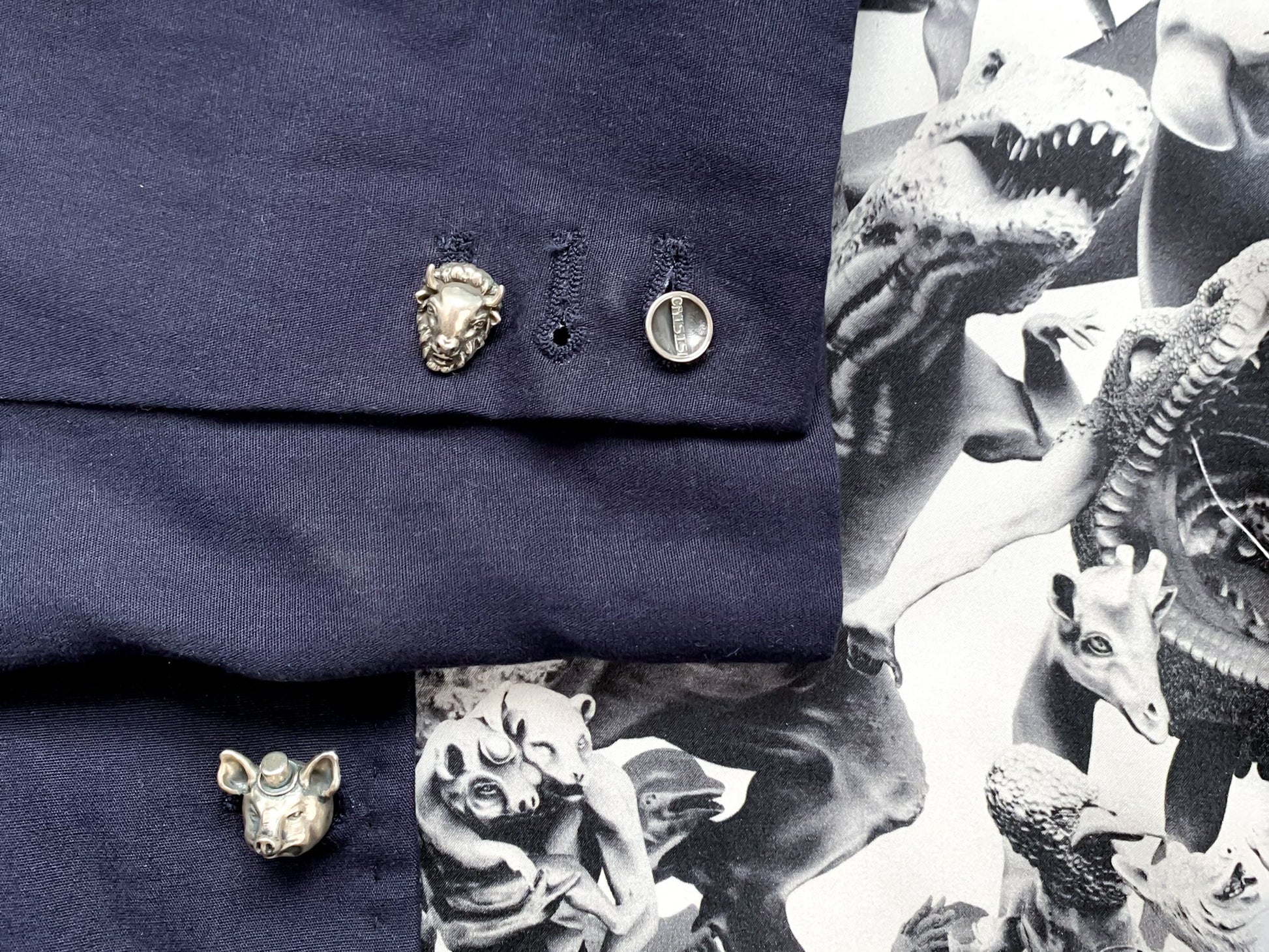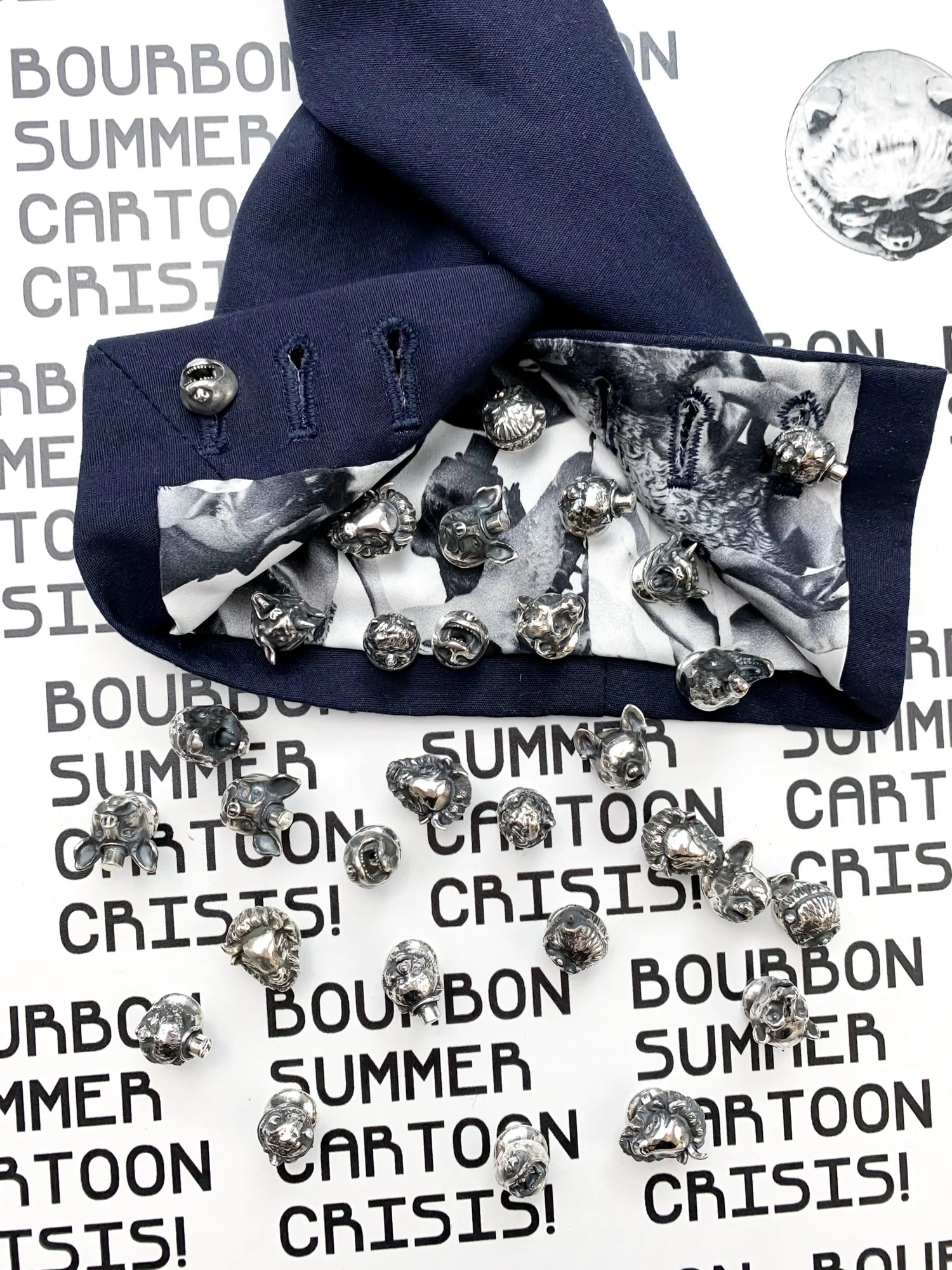 BOURBON SUMMER CARTOON CRISIS!’s unique cufflinks showcase the menagerie of party animals from FORMAL AFFAIR, the original CRISIS! artwork.